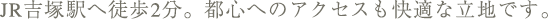 アクセス環境の利便性に優れたJR「吉塚」駅からは、JR「鹿児島本線」と、「篠栗線」の2路線が乗り入れできる。 近くには県庁があり、快速も止まり、博多駅から1駅は魅力。 バス路線も多数、地下鉄も利用可能。 病院・スーパー、教育機関も周辺に位置し生活利便も充実。